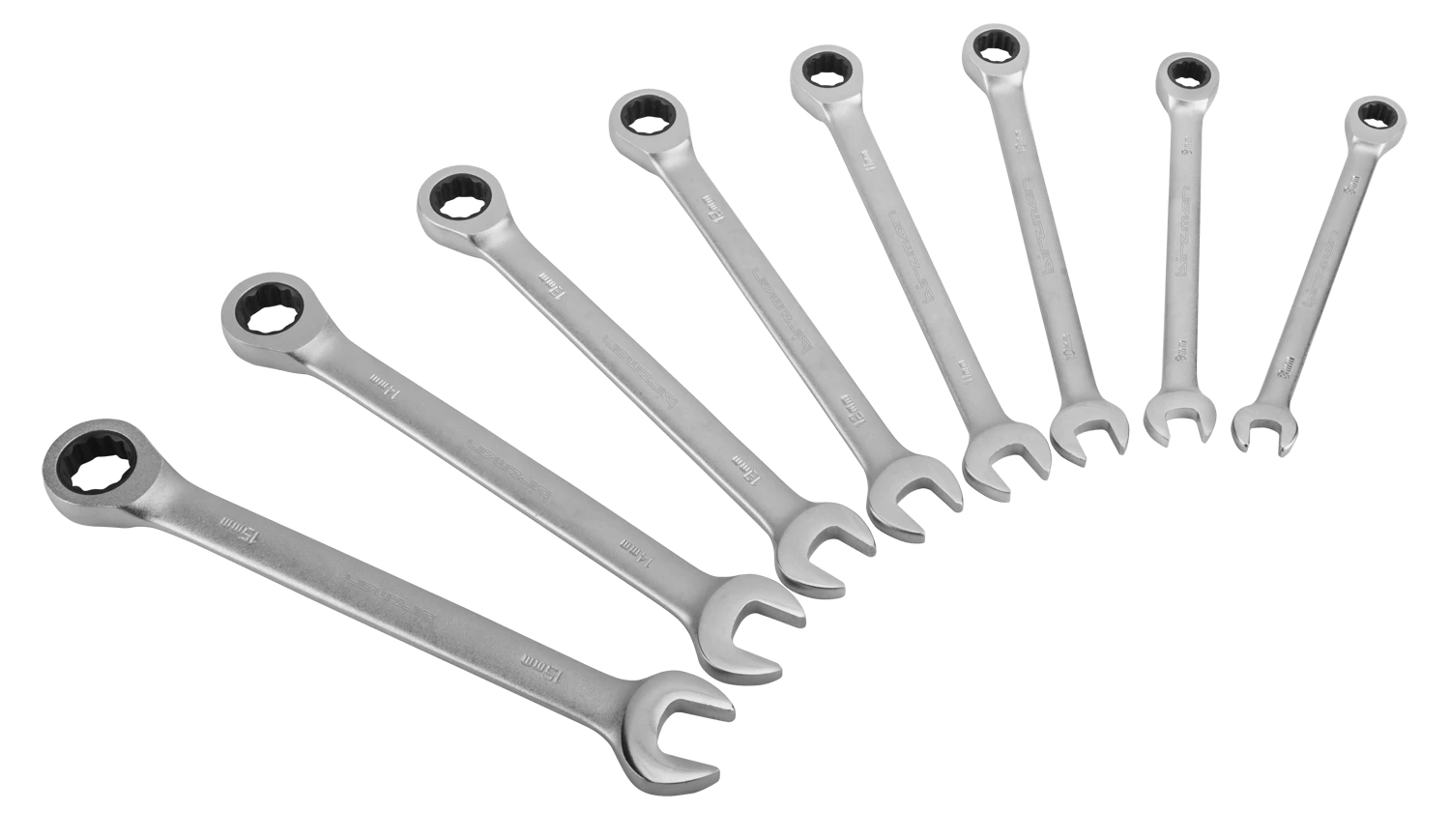 Sættet indeholder fastnøgler i størrelserne: 8 / 9 / 10 / 11 / 12 / 13 / 14 / 15 mm.