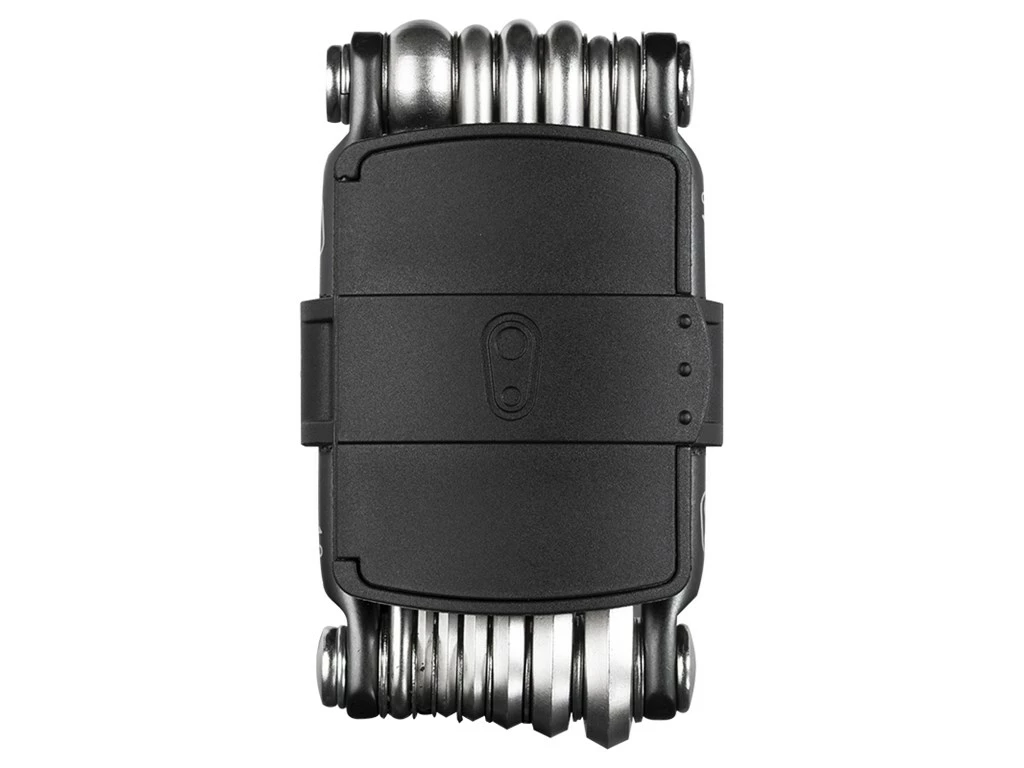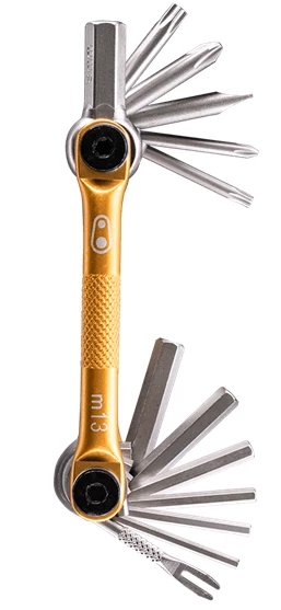 Multiværktøj fra Crankbrothers med 13 forskellige stykker værktøj, inklusiv et integreret dæk plug værktøj.