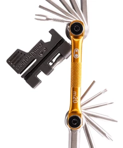 Multiværktøj fra Crankbrothers med 20 forskellige stykker værktøj, inklusiv et integreret dæk plug værktøj, samt opbevaring til plugs og ekstra kædelink.