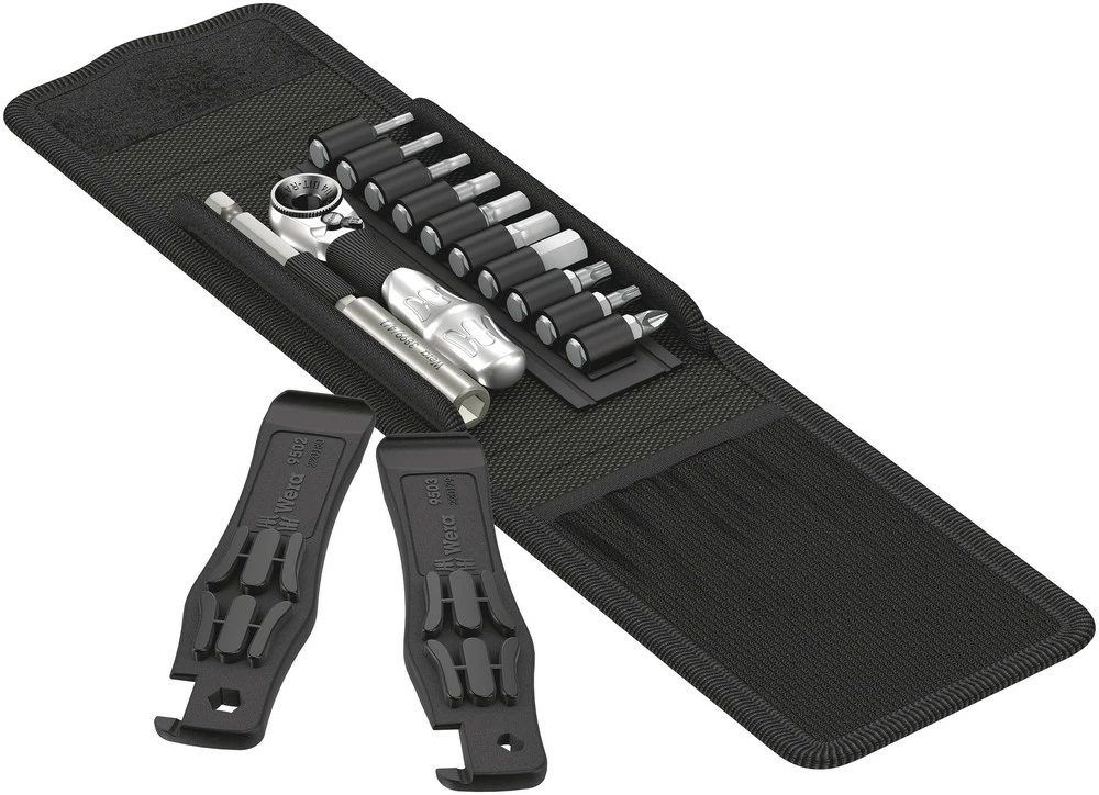 Et kompakt multitool-sæt fra Wera kan enhver cykelentusiast bruge. Her får man en lille skraldenøgle til de trange steder på cyklen inkl. bits, en forlænger og dækjern.